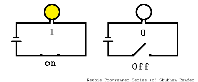 Logic of on and off, 1 and 0, based on bulb glows or not.